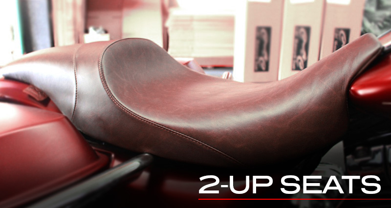We offer 3 different styles of 2up seats. The low pro, The square back and the sport touring. All 3 can have a 2” push added to them as well as a drivers removable backrest. We also offer custom air bags for all of our seats. Please call us to design your seat and its cover!